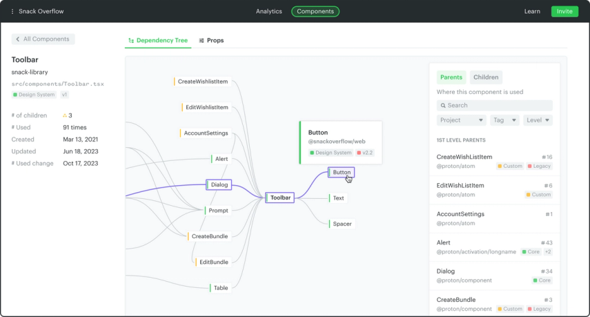Dependency tree: Easily see and track the relationship between components, such as how many children they have, and more importantly, exactly where they are being used.